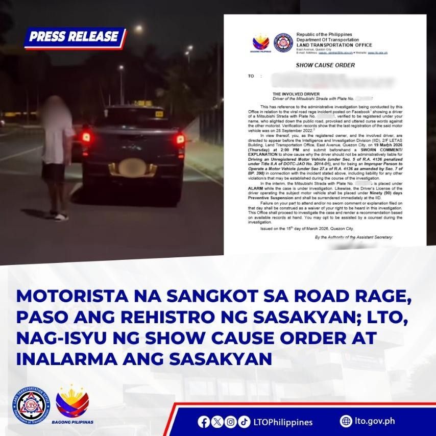 Isang netizen mula sa The VISOR Community ang nag-ulat ng isang event na naganap noong nakaraang Linggo sa BGC , ito ay ang “Sports Car for a Cause". Ayon sa ulat, tatlong sasakyan na hindi naman opisyal ng gobyerno o emergency vehicle ang nagmamaneho ng walang ingat, at gumagamit pa ng blinkers at sirena—mga aksyong labag sa batas trapiko dahil hindi sila sakop sa mga authorized exceptions. Ito rin ay nagdudulot ng panganib sa ibang mga motorista at mga pedestrian sa isang busy na lugar tulad ng BGC. Bilang tugon sa ulat na ito, ang Land Transportation Office (LTO) ay naglabas ng Show Cause Orders sa mga kasangkot na drivers at rehistradong may-ari ng mga sasakyan. Ayon sa SCO. ang mga sangkot ay inaatasan na humarap sa pagdinig ng LTO at magsunite ng sinumpaang salaysay at ipaliwanag kung bakit hindi sila dapat kasuhan sa paglabag sa batas trapiko tulad ng reckless driving, signals on starting, stopping ot turning, disregarding traffic signs, unauthorized/unlawful use of blinkers at improper person to operate a motor vehicle. Habang patuloy ang imbestigasyon, ang mga sasakyan ay inilagay sa alarm status at ang lisensya ng mga driver ay pansamantalang sinuspinde sa loob ng siyamnapung araw. Kung hindi sila makakapunta o hindi makakapagbigay nito, ang desisyon ay ibabatay sa mga ebidensyang hawak ng ahensya Sila rin ay maaaring humingi ng tulong sa abogado habang nagpapatupad ng mga prosesong ito. #LTO #LTOPH #LTOPhilippines #DOTrLTO #BagongPilipinas #BagongLTOsaBagongPilipinas #LTOZeroCorruption #TotoongSerbisyoWagNegosyo #NoSettlementPolicy